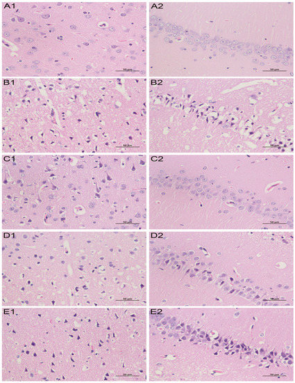 Hematoxylin-eosin (HE) staining results of brain tissue (×400): Nerve cells in the cerebral cortex for the control group (A1), model group (B1), nimodipine group (C1), H-TCNDS group (D1), and L-TCNDS group (E1). Nerve cells in the CA1 region of hippocampus for the control group (A2), model group (B2), nimodipine group (C2), H-TCNDS group (D2), and L-TCNDS group (E2). H-TCNDS meaned high dosage of TCNDS (316.34 mg·kg−1·d−1), and L-TCNDS meaned low dosage of TCNDS (158.17 mg·kg−1·d−1).