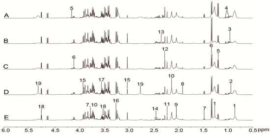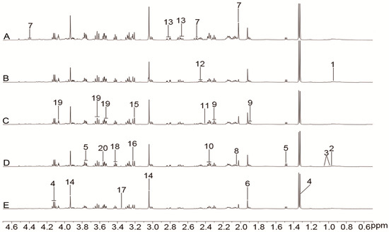 Representative 1H-NMR spectra (0.5–6.0 ppm) of plasma for the control (A), model (B), nimodipine (C), H-TCNDS (D), and L-TCNDS (E) groups. Key metabolites: 1. VLDL/LDL; 2. isoleucine; 3. leucine; 4. valine; 5. 3-hydroxybutyrate; 6. lactate; 7. alanine; 8. acetate; 9. N-acetyl glycoprotein; 10. methionine; 11. acetone; 12. acetoacetate; 13. Pyruvate; 14. glutamine; 15. creatine/phosphocreatine; 16. trimethylamine-N-oxide /betaine; 17. glycine; 18. α-glucose; 19. poly unsaturated fatty acid. H-TCNDS meaned high dosage of TCNDS (316.34 mg·kg−1·d−1), and L-TCNDS meaned low dosage of TCNDS (158.17 mg·kg−1·d−1).