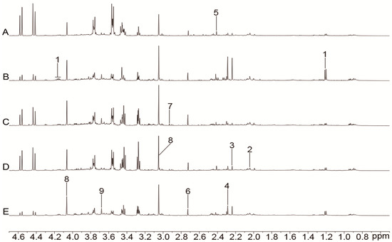 Representative 1H-NMR spectra (0.5–4.7 ppm) of urine for the control (A), model (B), nimodipine (C), H-TCNDS (D), and L-TCNDS (E) groups. Key metabolites: 1. 3-hydroxybutyrate; 2. N-acetyl glycoprotein; 3. acetone; 4. acetoacetate; 5. succinate; 6. dimethylamine; 7. dimethylglycine; 8. creatinine; 9. phenylacetyl-glycine. H-TCNDS meaned high dosage of TCNDS (316.34 mg·kg−1·d−1), and L-TCNDS meaned low dosage of TCNDS (158.17 mg·kg−1·d−1).