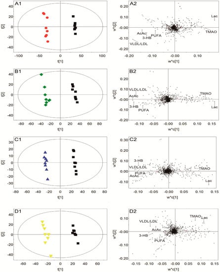 The representative 1H-NMR spectra of plasma, urine, and brain tissue are shown in Figure 3, Figure 4 and Figure 5 with metabolites labeled. Major endogenous metabolites were assigned according to the previously reported data [16,17,18] and two-dimensional (2D) NMR (Figures S1–S6). 1H-NMR data of these metabolites in rat plasma, urine, and brain tissue are listed in Tables S1–S3. Principal component analysis (PCA) was firstly performed for all groups in plasma, urine, and brain tissue. All the PCA results (Figure S7) showed that none of the spots was located outside of the confidence interval. Partial least squares discriminant analysis (PLS-DA) was then used to enlarge the distinction between groups. As shown in Figure 6, it was found that the nimodipine and TCNDS groups were clearly separated from the model group, and they were drawn close to the control group, indicating that TCNDS relieved the metabolic disorders in plasma, urine, and brain tissue and thereby exerted protective effect on MCAO rats in agreement with neurobehavioral and histopathological assessments.