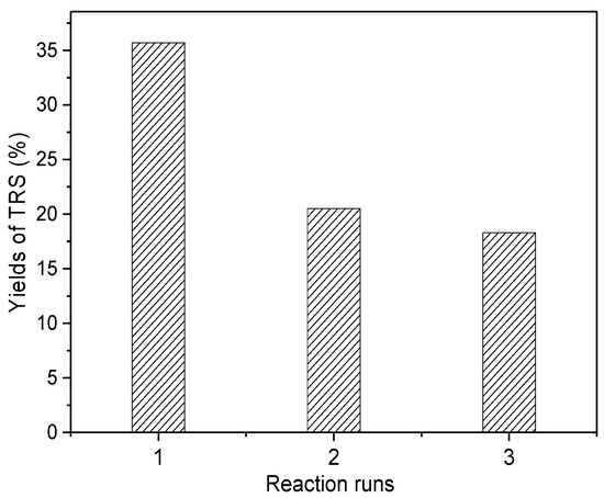 | Entry | Catalysts | Content of Acidic Sites (mmol·g−1) | TRS Yield (%) | 5-HMF Yield (%) |
