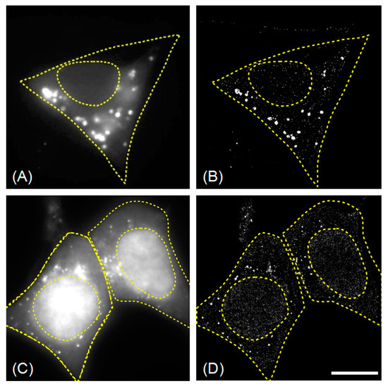 Notably, the subcellular distributions of the two overexpressed Atg8 proteins fused to EYFP are quite different: While EYFP-GABARAP is found mainly in the cytoplasm, EYFP-LC3B shows a higher concentration in the nucleus than in the cytoplasm. The larger labelled structures, however, are exclusively found in the cytoplasm for both proteins. These findings are in good agreement with data reported in literature [1,2,3,4,5,6]. Indeed, LC3B is thought to reside in the cell nucleus in an inactive acetylated form, which serves as a reservoir to be mobilised upon autophagy stimulation [23]; a different LC3 fraction associated with nuclear insulin receptor substrate 1 (IRS-1) has been suggested to attenuate autophagy in certain tumour cells [24]. GABARAP reservoirs, by contrast, have been identified on the ER and in the pericentriolar matrix [25], but not in the nucleus. Since the entire process of autophagosome biogenesis, maturation and degradation is known to take place outside the nucleus, we decided to focus on the cytoplasmic fraction of the fluorescently labelled objects for further analysis. Re-examination of the SMLM images under this premise yields much more similar values of 1550 ± 286 cytoplasmic EYFP-GABARAP containing structures (CS-EYFP-GABARAP) and 1813 ± 233 cytoplasmic EYFP-LC3B containing structures (CS-EYFP-LC3B), respectively (see Table 1). Thus, the before determined larger number of fluorescently labelled structures in EYFP-LC3B expressing cells, compared to EYFP-GABARAP expressing cells, is caused to a large extent by the nuclear protein fraction in the former case. One last remark to Figure 1C,D, i.e., wide-field and SMLM fluorescence images of EYFP-LC3B expressing cells, needs to be made. The fluorescence intensity contrast between nucleus and cytoplasm in Figure 1C is considerably larger when compared to the difference in numbers of fluorescent structures in those two areas of the cell. This can be explained by properties of the two detection methods, e.g., the larger focal depth of fluorescence wide-field imaging vs. single molecule detection or possible losses of single molecule detection when two many molecules emit in the same image.