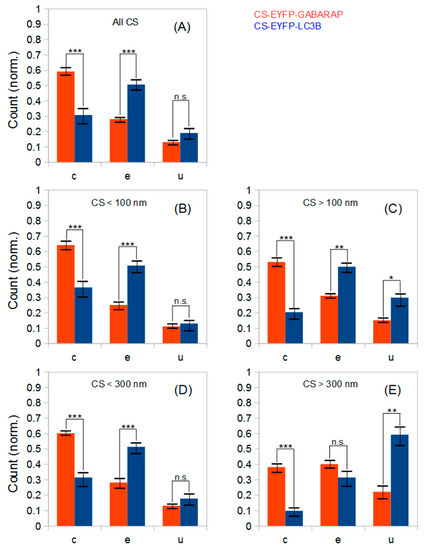 The five shape distributions of CS-EYFP-LC3B are plotted in Figure 5 next to the corresponding ones of CS-EYFP-GABARAP, and direct comparison immediately reveals that populations of structures labelled by EYFP-LC3B and EYFP-GABARAP differ from one another. For all five categories of CS-EYFP-LC3B, ellipses constitute the major fraction (31–51%), while circles—the major fraction for CS-EYFP-GABARAP—were only the second most prevalent for total and the small-size groups of CS-EYFP-LC3B (ca. 30%) and even the minor fraction for the large-size groups of CS-EYFP-LC3B (10–20%). U-shape objects among the CS-EYFP-LC3B were found to be present in higher relative amounts (13–59%) compared to CS-EYFP-GABARAP, being the most abundant shape for CS-EYFP-LC3B larger than 300 nm.