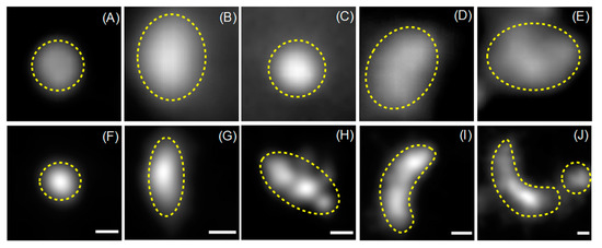 To demonstrate this issue, wide-field and super-resolution fluorescence images of five conventionally selected CS-EYFP-LC3B are depicted in Figure 6 (similar examples can be found for CS-EYFP-GABARAP). The structures in A and C are circles, while B, D and E fall into the ellipse category when judged by the wide-field fluorescence images. This simple picture changes when examining the fluorescent structures in the respective SMLM images. While the structures in A (circle) and B (ellipse) appears to have the same shape in super-resolution (compare with F and G, respectively), the other three structures have a different shape when imaged and analysed with higher spatial resolution. The ellipse in D turns into a U-shape in I, while the circle in C resolves into an inhomogeneous ellipse in H. The ellipse in E even appears to be clearly two objects in J, a U-shape and a circle.