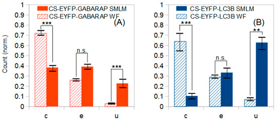 Shape distributions of fluorescently labelled cytoplasmic structures identified in the wide-field images of ten EYFP-GABARAP expressing and ten EYFP-LC3B expressing HEK293 cells, respectively, under starvation and bafilomycin A1 treatment. (A) Conventionally selected CS-EYFP-GABARAP (348) classified in wide-field fluorescence (hatched bars) and the same structures classified in the respective SMLM (full bars) images; (B) Conventionally selected CS-EYFP-LC3B (486) classified in wide-field fluorescence (hatched bars) and the same structures classified in the respective SMLM (full bars) images. Error bars represent standard error of the mean. Statistical significance is represented as P ≤ 0.01 (∗∗∗); P ≤ 0.05 (∗∗), and P ≤ 0.1 (∗) from two-tailed t-tests (n.s., not significant). c, e and u stands for circles, ellipses and U-shapes.