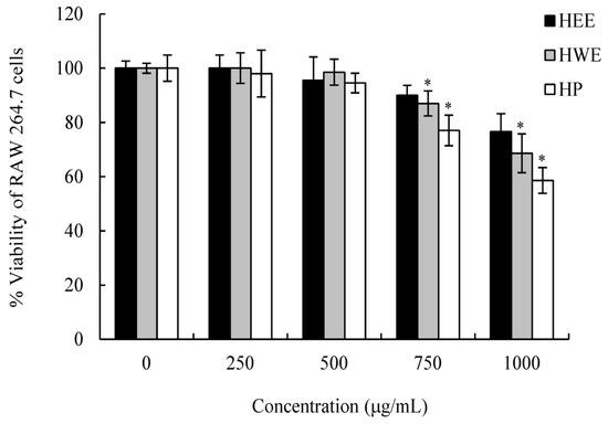 | HWE | 100 μg/mL | 2.51 ± 0.53 * | 1.87 | 6.71 ± 2.12 * | 1.38 |