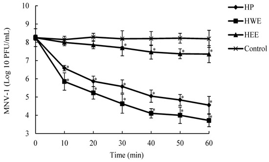 2.4. Time-Dependence Experiment of HP, HWE, and HEE on Viral Count Reduction