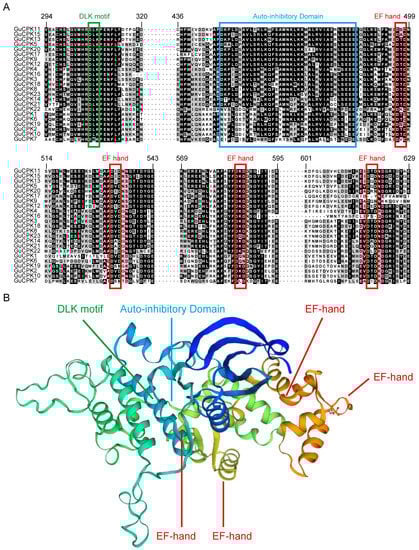Multiple sequence alignment and conserved domain analysis of the G. uralensis calcium-dependent protein kinases (GuCPKs). (A) Sequence alignment and conserved domain analysis of the 23 GuCPKs. The detailed protein sequence information of the 23 GuCPKs is provided in Supplementary Table S3. The partial GuCPK protein sequences were selected and the corresponding conserved domains were boxed by different colors. (B) Three-dimensional structure of the GuCPK conserved domains. The structure was created using the Swiss-Model workspace (http://swissmodel.expasy.org) for GuCPK12 as a representative sequence. The regions of the conserved domains are indicated.