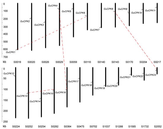 Scaffold distribution of GuCPKs in G. uralensis. GuCPK genes are located on 23 individual scaffolds. Vertical columns represent the scaffolds with scaffold numbers at the bottom and scale bars on the left. Pairs of segmentally duplicated genes are indicated by red dashed lines.