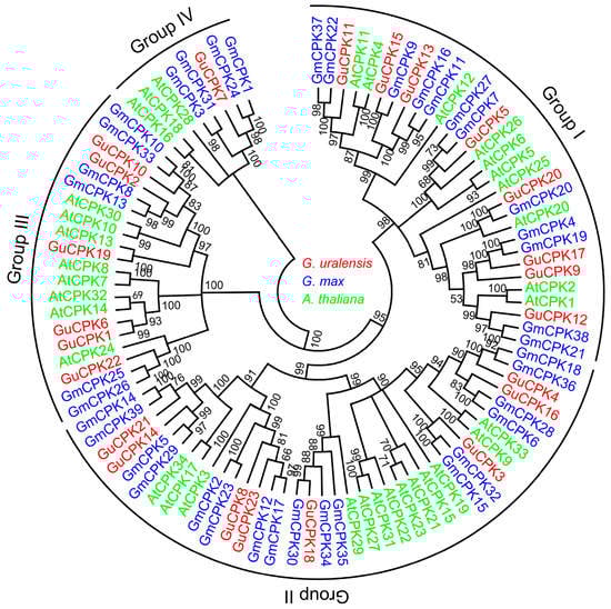 Phylogenetic relationship analysis of the CPK family. A total of 96 CPK proteins from G. uralensis (GuCPK), Arabidopsis (AtCPK) and G. max (GmCPK) were used to constructed a phylogenetic tree by ClustalX 2.0 and MEGA5.0 software with the neighbor-joining (NJ) method of 1000 bootstrap replicates. The CPK proteins of G. uralensis, Arabidopsis, and G. max were shown in red, green, and blue, respectively.