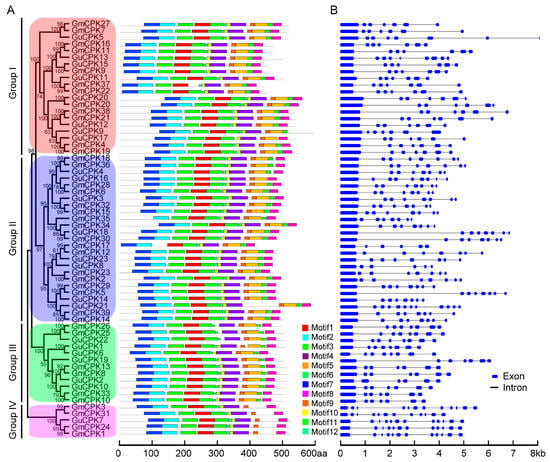 In order to investigate the phylogenetic relationships of GuCPK gene family members, a total of 96 CPK proteins from G. uralensis, Arabidopsis, and G. max were used to construct the phylogenetic tree, which indicated that the CPKs were clustered into four major groups (groups I–IV) (Figure 3). The GuCPK proteins had 12 conserved motifs distributing on different positions (Figure 4A). The exon/intron organization analysis indicated that the GuCPK members of different groups showed diverse gene structures (Figure 4B). This demonstrated that GuCPKs in the same group had highly conserved motif distributions and similar exon/intron structures.