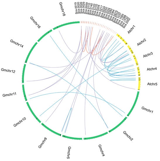 Segmental duplication of GuCPK genes and syntenic analysis of G. uralensis, G. max, and Arabidopsis CPK genes. Chromosomes and scaffolds were shown in different colors with circular form. The positions of the CPK genes were marked with black lines on the circle. The duplicated CPK pairs in G. uralensis were linked by red lines, syntenic relationships between G. uralensis and the other two species were linked by purple lines, and blue lines indicated the CPK pairs between or inside G. max and Arabidopsis.