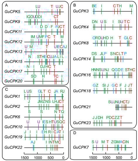 Plant CPKs share typical domains, which endow the CPK enzymatic activity to phosphorylate the substrate and accordingly to transduce the cellular calcium signal [12]. GuCPKs have the similar conserved domains that contain the DLK motif, autoinhibitory domain, and Ca2+-binding EF-hand motifs (Figure 1). The DLK motif is highly variable and includes N-myristoylation and S-palmitoylation sites for sub-cellular localization [19,28]; 21 AtCPKs have two of those sites that decide their localization on the plasma membrane in Arabidopsis [19,37]. ZmCPK1 had a N-myristoylation site and was predominately localized to the cytoplasm and nucleus [38]. A total of 17 and 12 of the GuCPK proteins contained potential N-myristoylation and S-palmitoylation sites, respectively. The prediction of the subcellular distribution of the 23 GuCPK proteins are localized to the plasma membrane (Supplementary Table S3), indicating that the N-myristoylation and S-palmitoylation sites of GuCPK might be functional in membrane targeting and the stability of GuCPK proteins. The number and position of EF-hands had critical roles in activating the CPK by Ca2+-binding affinities [39,40]. All the GuCPKs contained four EF-hands, which were also found in Arabidopsis, rice, and maize, allowing the CPK proteins as a Ca2+ sensor to fulfill the potentially similar biological functions [11].