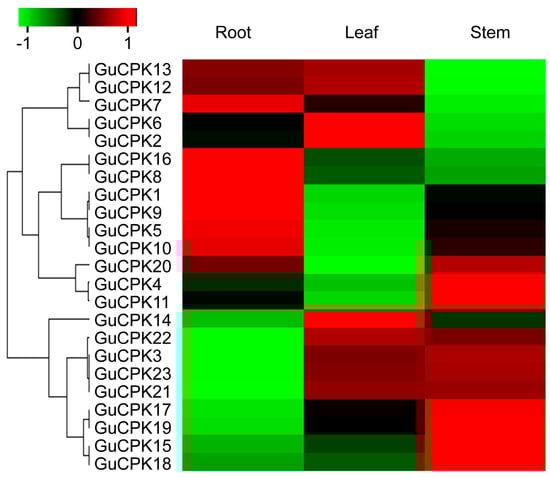 Heatmap of expression levels of G. uralensis GuCPKs in different tissues. The expression levels of GuCPKs were determined by qRT-PCR. The GuCPK genes were ordered by the cluster of their expression patterns. Each value denotes the mean relative level of expression of three replicates. Higher or lower expressions of GuCPK genes in different tissues were colored by red or green, respectively. The color bar is shown in the upper apex. The visualized heatmap was generated using R package based on the qRT-PCR data.
