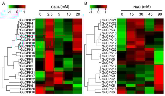 In the light of CPKs’ important roles in calcium signal transduction and in response to salt stress [34], in order to analyze the GuCPK expression profiles under CaCl2 and NaCl treatments, the relative expression levels of the 23 GuCPKs were detected and visualized by a qRT-PCR based heatmap using the materials treated by CaCl2 and NaCl with different concentrations. The results showed that almost all the GuCPKs demonstrated a prompt upregulation after 2.5 mM of CaCl2 treatment, except for GuCPK20, which showed a significant decrease expression under any concentration point of CaCl2 treatment. In addition, there were four (GuCPK21, GuCPK17, GuCPK22, and GuCPK14) and 10 GuCPKs (GuCPK12, GuCPK4, GuCPK11, GuCPK8, GuCPK10, GuCPK2, GuCPK19, GuCPK18, GuCPK23, and GuCPK3) that indicated significant accumulations after 2.5 mM and 20 mM of CaCl2 treatment, respectively. Three GuCPKs (GuCPK6, GuCPK20, and GuCPK16) displayed decreased expressions after the supplement of CaCl2 (Figure 8A). In terms of NaCl treatment, the expressions of the 23 GuCPKs demonstrated two typical clusters; one contained 14 GuCPKs that showed accumulated expressions after 15 mM or 30 mM of NaCl treatment, and another included the remaining GuCPKs (except GuCPK6) that indicated significant enrichments after 90 mM of NaCl stimulation (Figure 8B).