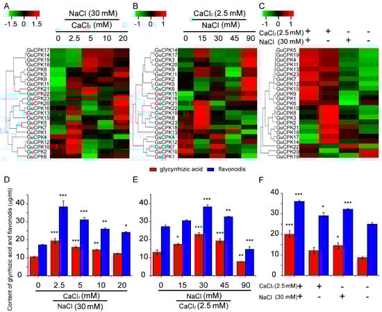 Considering that the promotions of secondary metabolites by salt stress were observed, and that glycyrrhizic acid and flavonoids were the main medicinal ingredients in G. uralensis [31,32], therefore, the appropriate concentrations of CaCl2 and NaCl were chosen to treat the G. uralensis roots to investigate the correlation between GuCPK expression and the biosynthesis of glycyrrhizic acid and flavonoids. The GuCPKs exhibited predominant expressions and rapid responsiveness under treatments of 2.5 mM of CaCl2 and 30 mM of NaCl (Figure 8, Supplementary Figure S1). In addition, after the supplement of 30 mM of NaCl and different concentrations of CaCl2, the GuCPKs indicated distinct expression patterns, and the content of both the glycyrrhizic acid and flavonoids reached the peak value at the point of 2.5 mM of CaCl2 (Figure 9A,D). When 2.5 mM of CaCl2 was appended, after the addition of different concentrations of NaCl, the GuCPKs showed diverse expression features, and the content of both the glycyrrhizic acid and flavonoids accumulated the highest level at the concentration of 30 mM of NaCl (Figure 9B,E). Interestingly, by the application of the mixture of 2.5 mM of CaCl2 and 30 mM of NaCl, the GuCPKs displayed an obvious expression pattern with the 12 GuCPKs that exhibited significant increased expression. Meanwhile, the content of glycyrrhizic acid and flavonoids were also measured to be the maximum value (Figure 9 C,F). These results suggest that there may exist a close link between the significant accumulation of GuCPKs and the promoted production of glycyrrhizic acid and flavonoids under salt stress.