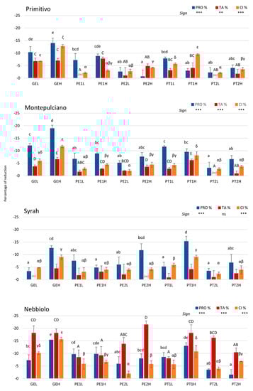 Reduction percentage of wine proanthocyanidins (PRO) after fining treatments with proteins of animal origin like gelatin (GE) and of vegetal origin from pea (PE1, PE2) and potato (PT1, PT2) with respect to the untreated wine, compared to reduction percentage of total anthocyanins (TA) and color intensity (CI). All data are expressed as the average value of individual treatments with respect to the control ± standard deviation (n = 3). Different lowercase Latin letters for PRO, different uppercase Latin letters for TA, and different lowercase Greek letters for CI indicate significant differences among treatments according to Tukey test (p < 0.05), respectively. Sign: **, ***, and ns indicate significance at p < 0.01, 0.001, and not significant, respectively. GE = Gelatin, PE1 = Pea 1, PE2 = Pea 2, PT1 = Potato 1, PT2 = Potato 2, L = low dose, H = high dose, (nr) = no reduction occurred.