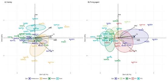 Principal component analysis (PCA) of phenolic compounds and color data obtained from wines after fining treatments with proteins of animal origin like gelatin (GE) and of vegetal origin from pea (PE1, PE2) and potato (PT1, PT2). PCA was performed on each parameter reduction with respect to the control. Confidence ellipses (p < 0.05) were drawn for variety (A) and fining agents formulation (B). Treatments corresponded to GE = Gelatin, PE1 = Pea 1, PE2 = Pea 2, PT1 = Potato 1, PT2 = Potato 2, L = low dose, H = high dose. Variety: Pr = Primitivo, Mo = Montepulciano, Sy = Syrah, Ne = Nebbiolo.