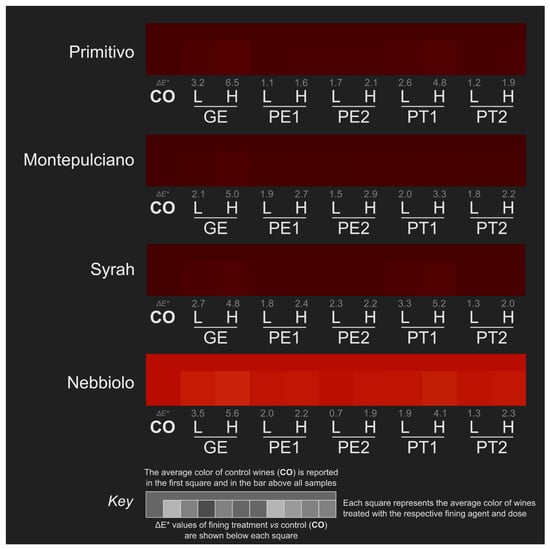 As can be observed in Figure 3, ΔE* data evidenced several important trends among fining agents for all the varieties evaluated. Gelatin treatments at high dose (GEH) gave the highest ΔE* values of the study, the resulting wines consistently achieving ΔE* values above 4.8 units. Only PT1 (potato-based) fining agent also at the high dose was found to cause a similar color reduction with ΔE* ranging from 3.3 to 5.2; these values being higher than those for GEH only in the case of Syrah wines. Furthermore, Primitivo and Nebbiolo wines treated with gelatin at a low dose (GEL) showed a visually perceived color reduction, as well for PT1 at a low dose (PT1L) in Syrah wine (ΔE* values between 3.2 and 3.5). No other pea and potato-based fining agent reached ΔE* values above three units, regardless of the dose considered.