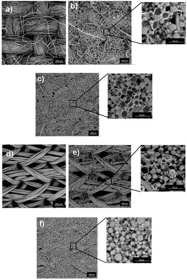 The raw woven fabric (Figure 1a) has a denser structure than the raw knitted fabric (Figure 1d), which has larger air spaces. The surface of modified W fabrics is covered evenly. Due to the denser fabric structure, the coating layer is mainly on the surface, not entering the spaces between the weft-warp and interfibrillar systems. The W fabric with paste P/20 (Figure 1b) is covered with a thin layer of MPCM paste as evidenced by many fibers protruding above the modified surface. The coating layer of W fabric with paste P/40 is thicker (Figure 1c), we observe single fibers above the coating surface. In turn, the surface of K fabric is coated unevenly due to significant air spaces in the structure. During the coating process, paste with MPCM is incorporated into the fibers in air spaces and on the fabric surface, which causes unevenness. On the Figure 1f we observe a greater coating of the K fabric structure with paste P/40 than with paste P/20 (Figure 1e), for which MPCM are observed in the fibers inside the air spaces. For all modified fabrics, the presence of damaged MPCMs is observed. Some of the microcapsules on the surface are damaged by the action of the coating knife. This represents a small and comparable percentage for all samples. Inside the coating layer, the microcapsules were not damaged. MPCM used for fabrics modification have regular, spherical shapes [11]. Only damaged microcapsules on the coating layer surface are cracked, what is an effect of coating process. Damages of microcapsules during the pastes application on dense woven fabric structure are greater than to the more porous knitted fabric structure, as seen in Figure 1b,c,e,f. Plain material W has an ordered, compact structure and relatively less airspace than material K, which results in greater interaction with the paste during coating. MPCMs on the surface are more susceptible to damage than on K materials, where microcapsules can also enter the spaces between the fibers, which protect them from damage (Figure 1a,d). The resulting defects were not observed in our previous studies [6,7,8], in which printing, padding and coating techniques using a 0.1 mm gap were applied [7]. In this research the smaller gap (0.05 mm) cause more pressure on microcapsules, which is why they are partially damaged, especially on the dense woven fabric.