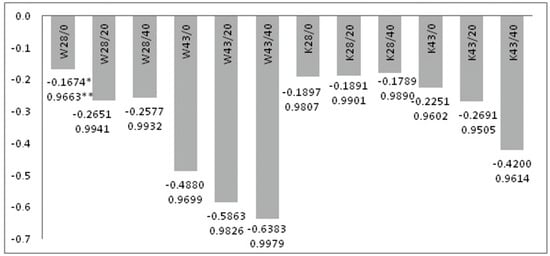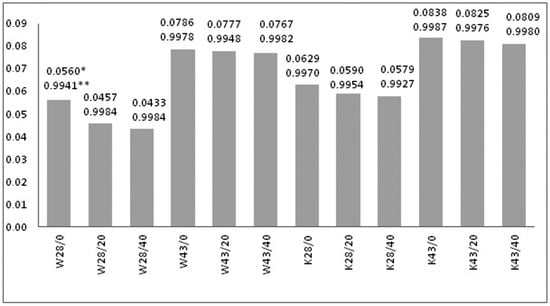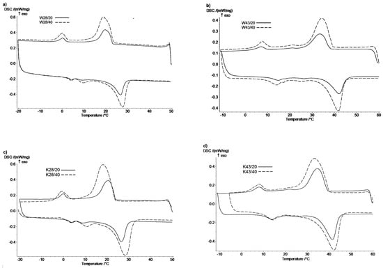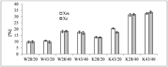 On the basis of the estimated values of Xm and Xc, the coefficient of thermal efficiency of the W28/20 fabric was about 9%, meaning 9% of active MPCM28 is on the W fabric, while on W28/40 it is about 17% (Figure 3). This confirms the results of the microscopic analysis (Figure 1b,c). In turn, the K28/20 and K28/40 K fabrics contain about 17% and 33% of MPCM, respectively, and so the microcapsules have been damaged to a lower extent than on W fabrics (Figure 1e,f). The W43/20 fabric coefficient of thermal efficiency is about 11%, and the W43/40 fabric is about 18% for MPCM43. K fabrics K43/20 and K43/40 contain respectively about 20% and 33% of active MPCM43.