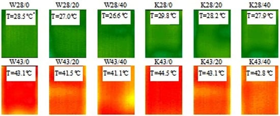 Based on the thermograms recorded during the cooling process, the mean surface temperature from the cooling time dependence of the MPCM28 and MPCM43 modified materials was determined (Figure 8).