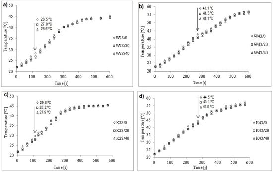 The temperature dependence on heating time for: (a) woven fabrics W28/0, W28/20, W28/40; (b) wovenfabrics W43/0, W43/20, W43/40; (c) knitted fabrics K28/0, K28/20, K28/40; (d) knitted fabrics K43/0, K43/20, K43/40.