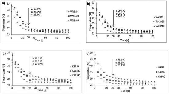 Temperature changes in the surface of materials during cooling process for: (a) woven fabrics W28/0, W28/20, W28/40; (b) woven fabrics W43/0 W43/20, W43/40, (c) knitted fabrics K28/0, K28/20, K28/40; (d) knitted fabricsK43/0, K43/20, K43/40.