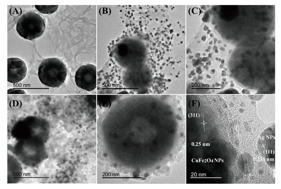 TEM images of the (A) CuFe2O4/CNC nanocomposites; (B,C) CuFe2O4/CNC@Ag nanocomposites; (D,E) CuFe2O4/CNC@Ag@ZIF-8 nanocomposites; (F) HRTEM image of CuFe2O4 nanoparticles (NPs) and Ag NPs.