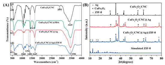 Figure 3A presents the FTIR spectra of (a) CuFe2O4/CNC, (b) CuFe2O4/CNC@PDA, (c) CuFe2O4/CNC@Ag, and (d) CuFe2O4/CNC@Ag@ZIF-8. In line (a), the adsorption peaks at 430 cm−1, 580 cm−1, and 3425 cm−1 correspond to the Fe–O, Cu–O, and O–H stretching vibrations, respectively [41,42]. The band at 1645 cm−1 was due to the O–H bending vibration in CNC [43]. The absorbance bands at 2893 cm−1, 1400 cm−1 and 1060 cm−1 were assigned to the C–H stretching vibration, the C–H deformation vibration and the C–O–C stretching of pyranose, respectively [15,44], which indicated that the CuFe2O4 NPs were successfully immobilized on the CNC. In line (b), besides the characteristic adsorption peaks of line (a), the adsorption peaks at 1513 cm−1 are related to the C=C stretching vibrations of aromatic ring [29]; the broad peak at 3390 cm−1 is attributed to the O–H and N–H stretching vibrations [42]; the peak appearing at 1294 cm−1 can be assigned to the C–OH stretching vibration of phenol compounds [43]; all the peaks above demonstrate that the CuFe2O4/CNC@PDA nanocomposites were successfully prepared. After immobilizing Ag on the CuFe2O4/CNC@PDA (line c), the intensity of the peak at 1294 cm−1 become weaker owing to the interaction between Ag NPs and PDA. The band at 421 cm−1 (shown in line (d)) was attributed to the Zn–N stretch mode [44]. The bands in the spectral region of 500–1350 cm−1 and 1350–1500 cm−1 were assigned as the plane bending and stretching of imidazole ring, respectively [44]. The bands of 2500–3500 cm−1 could be ascribed to stretching vibrations of –CH3, –NH– and –OH (Zn–OH) within the internal structure of ZIF-8 [45].