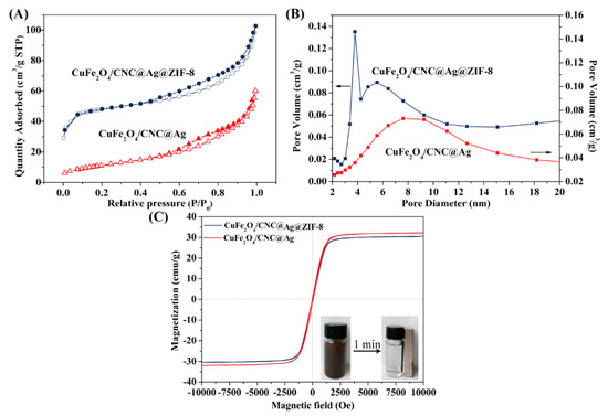 (A) N2 adsorption-desorption isotherms; (B) the pore-distribution curves; (C) the magnetic hysteresis curves of the CuFe2O4/CNC@Ag@ZIF-8 and CuFe2O4/CNC@Ag nanocomposites (the inset shows the magnetic separation behavior of the CuFe2O4/CNC@Ag@ZIF-8 nanocomposites in the aqueous solution).