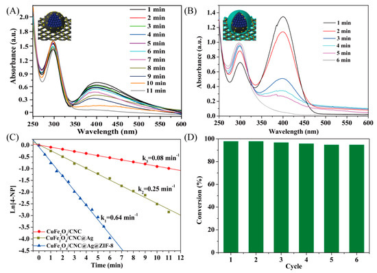 Typical time-dependent evolution of UV–Vis spectra showing the catalytic reduction of 4-NP to 4-AP by (A) CuFe2O4/CNC@Ag; (B) CuFe2O4/CNC@Ag@ZIF-8 nanocomposites; (C) plot of ln [4-NP] versus reaction time for the reduction of 4-NP using 3 mg CuFe2O4/CNC, CuFe2O4/CNC@Ag, and CuFe2O4/CNC@Ag@ZIF-8 nanocomposites; (D) conversion of 4-NP during six cycles of reaction by the CuFe2O4/CNC@Ag@ZIF-8 nanocomposites.