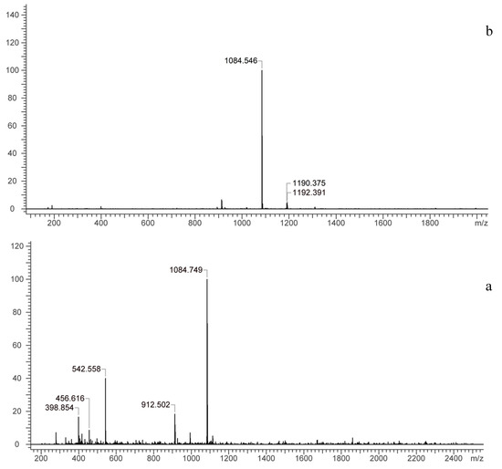 As can be seen from Table 1, almost in all cases stability constants of investigated complexes were higher in acetonitrile solution. This tendency to form complexes with higher stability constants with macrocyclic cyclotriphosphazene derivatives occurs for the first time. Usually, other derivatives were characterized by higher stability constants in methanol [31]. The much easier formation of the complexes in acetonitrile than in methanol was confirmed by MS analysis (Figure 1). On MS spectra in methanol (Figure 1b), we did not see signals indicating the various forms of the complex, whereas in acetonitrile (Figure 1a) ligand signals with silver ions were immediately visible (m/z = 1192). This was probably related to the strong solvation of the ligand by methanol. Solvent molecules will more easily penetrate into the polyether part, to which access is facilitated, as they are not heavily hindered by large substituents. Thus, the complex formed with a 1: 1 stoichiometry in methanol, which is formed with exocyclic nitrogen atoms from substituents, has a higher stability constant (log β = 8.61) in this solvent. The formation of further forms of complexes is probably hampered by solvent molecules. It is also worth noting that Fyles and Zeng, during the study of the formation of supramolecular complexes of cations with crown ethers, noted the electrospray ionization process can result in differential production of ions from the equilibrium mixture and comparisons between ions of differing charges or stoichiometries may not correspond to the inherent selectivity of the host in solution [65].