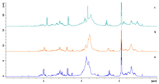 1H NMR spectra in acetonitrile solutions for uncomplexed ligand L-(a) and after adding silver ions with the Ag:L molar ratio 1:1 and 2:1-spectrum (b) and (c).