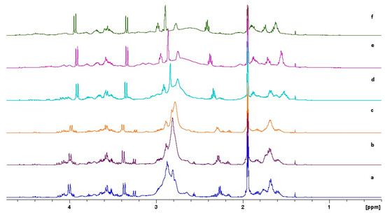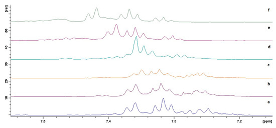 The 1H NMR spectra in acetonitrile solutions for free ligand L-spectrum (a) and after adding silver ions with the Ag:L molar ratio 0.5:1, 1:1, 2:1, 3:1, and 4:1-spectra (b), (c), (d), (e), and (f), respectively.