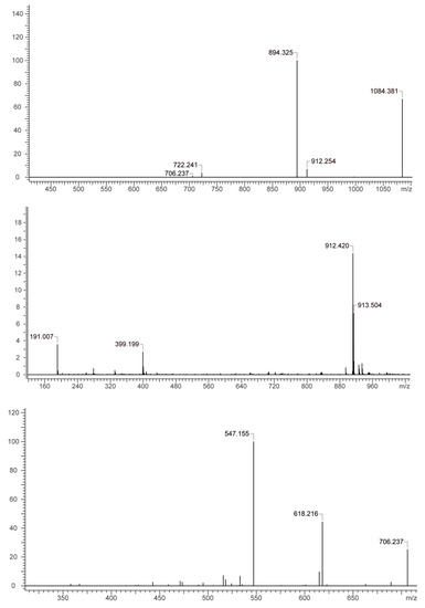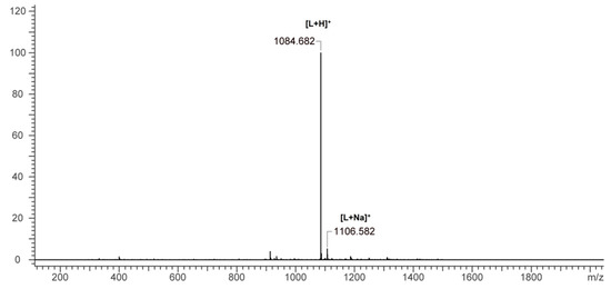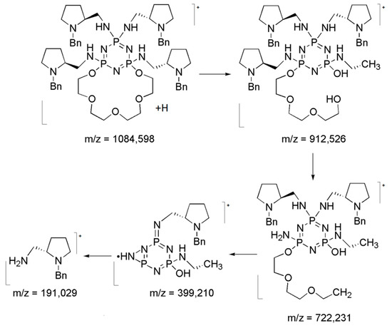 The ESI-MS results obtained for the basic measurements of the studied complexes are presented in Table 2. As one can see, the spectra of the investigated ligand L revealed the presence of the protonated molecule, at m/z = 1084.568 ([L + H]+), and a less abundant signal at m/z = 1106.582 corresponding to the sodium adduct of compound L+Na+ (Figure 5). The MS/MS fragmentation spectrum for the protonated ligand at m/z 1084 is presented in Figure 6. The analysis of the observed fragmentation ions shows two different series. The first fragmentation pathway passes through fragment ions with m/z 894, 706, 618, 547, 459 and 355 (Scheme 6). In the first phase, two substituents attached to endocyclic phosphorus atoms are detached, then the ring is broken down and the next fragment is removed from the substituent. The second path (Scheme 7) proceeds with the incomplete detachment of the two substituents attached to the endocyclic nitrogen atoms and further cleavage of polyether chain until a fragment of only one substituent is obtained (m/z 912, 722, 399, and 191).
