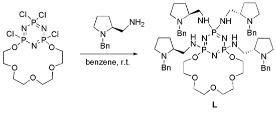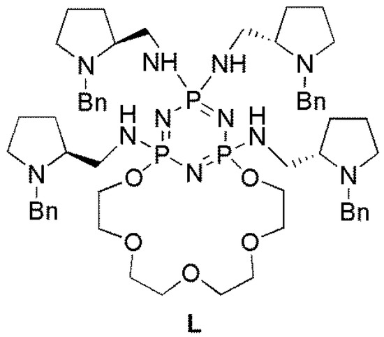 This derivative was obtained from the enantiomerically pure (S)-proline, which is widely used in organic synthesis [41,42] and is the convenient substrate in the preparation of a number of derivatives with potential biological activity [43,44]. The resulting ligand L has much more binding sites in its structure that can potentially attract metal ions: (1) Oxygen donor atoms derived from the macrocyclic backbone, (2) endocyclic nitrogen atom from the cyclotriphosphazene ring, (3) exocyclic nitrogen atoms from attached substituents, and (4) benzyl groups.