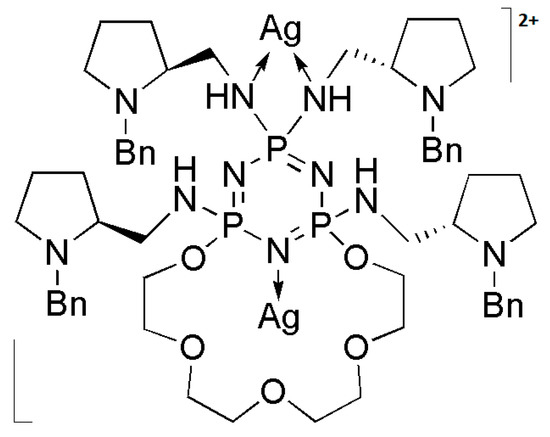 In our research group, the studies of the complexing properties of macrocyclic compounds with particular focus on P-pivot lariat ethers have been conducted for years [30,31,32,33,34]. These studies show that changes of substituents, as well as solvents used during the complexation process, affect the formation of the various structures of the complexes, especially with silver (I) cation. The studies for other cations comprise of the complexing behavior of PNP-lariat ether with other metal cations (Cd2+, Cu2+, Ca2+, and Pb2+) using ESI-MS and MS/MS techniques [35,36]. Macrocyclic derivatives of cyclotriphosphazene and their complexes were found to reveal antitumor activity as well as anti-AIDS activity [37,38,39]. Furthermore, these types of compounds are potentially useful as starting materials for the preparation of ‘pH-controlled active ion carriers’ in liquid membranes [40].