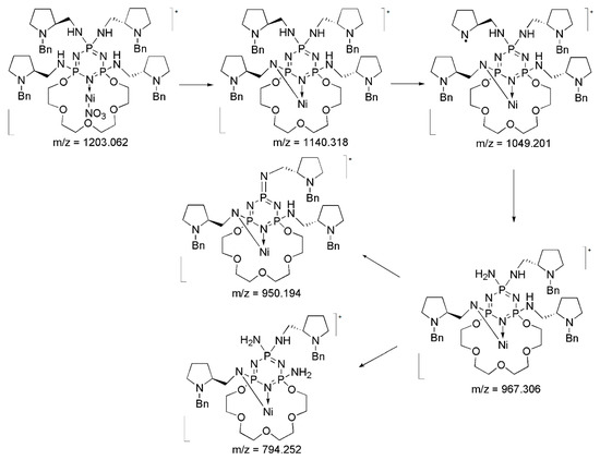 All divalent metal cations Co2+, Cu2+, Ni2+, and Zn2+ form only one type of complexes in which the nitrate anion is involved. The lack of other forms of complexes with divalent cations (Table 1 and Figure 8, Figure S1, Figure S2, Figure S3) for Ni2+, Co2+, Cu2+, and Zn2+ complexes, respectively) probably is related to very high steric hindrance of the parent molecule strictly connected with the branchy substituents attached to the cyclotriphosphazene subunit. Analyzing the ESI-MS spectra as well as tandem mass spectra and the subsequent fragmentation patterns of the complexes with individual divalent cations Figure 8 and Scheme 9 for [Ni(II)L + NO3]+ complex, and Figures S1–S6 and Schemes S1–S4 for the other investigated divalent metal ions complexes, one can see a similar tendency in the observed fragmentation routes. At the first step, the fragmentation of individual forms of complexes [ML + NO3]+ begins with the detachment of the nitrate anion, and then as a result of the ionization, the molecule loses the individual fragments of the substituents. For all doubly charged metal ions complexes, in all complexes of the ligand with divalent metal ions, the fragmentation patterns clearly show that the binding of the metal ion occurs via the endocyclic nitrogen atom. Due to the fact that in case of Ni(II), Zn(II), and Co(II) complexes the tandem mass spectra do not show the peaks related to the breaking of the polyether macrocyclic moiety of the ligand one can suppose that binding of the metal ion is also supported by additional interaction with oxygen atoms of the ligand cavity. Only in the case of Cu(II) ion, which in the experimental conditions is reduced to Cu(I), has the cleavage of the macrocyclic ring been observed, suggesting that in this case the binding of the metal ion is realized solely by endocyclic nitrogen atom of the cyclotriphosphazene subunit. Furthermore, the interaction is probably strengthened by additional stabilization by oxygen atoms from crown ether moiety (there is no cleavage of the macrocycle skeleton under the influence of the applied voltage during the experiment). Similar fragmentation pathways were also noticed in previous studies of these complexes with morpholinyl and piperidinyl substituents [35,36].