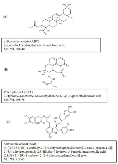Sample Availability: Samples of the compounds acetyl-α-boswellic acid, praeruptorin-A and salvianolic acid-B are available from the authors. |