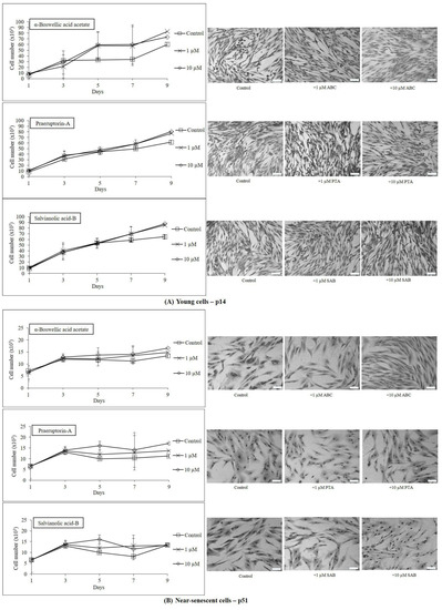 On the basis of the MTT results mentioned above, two concentrations (1 and 10 µM) of test compounds were selected for their effects on short term growth and morphology (up to 9 days). Figure 3 shows that all three compounds (ABC, PTA, and SAB) were growth supportive or slightly stimulatory for both early passage young (Figure 3A) and near-senescent cells (Figure 3B), but the differences were not statistically significant. This effect was further documented by showing the microphotographs of Giemsa-stained young and near-senescent PCS cells which maintained their morphology or looked thinner and elongated in the case of near-senescent cells (Figure 3B).