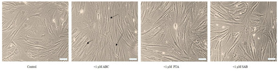 The possible rejuvenating or morphological-reversion effects of the test compounds were further tested on replicatively senescent cells at p58. Figure 4 shows that whereas control cells had typical senescent morphology in terms of being large, flat, irregularly arranged, and full of debris, cells treated with 1 μM ABC, PTA, or SAB were somewhat morphologically rejuvenated. This effect was more apparent in case of ABC-treated cells where a majority of the cells became elongated and rearranged in regular arrays (Figure 4; arrows). In this pilot study the so-called rejuvenation is only inferred from morphological observations, and would require further molecular determinations, such as epigenetic status including DNA methylation and telomere length as markers of ageing [9,32].
