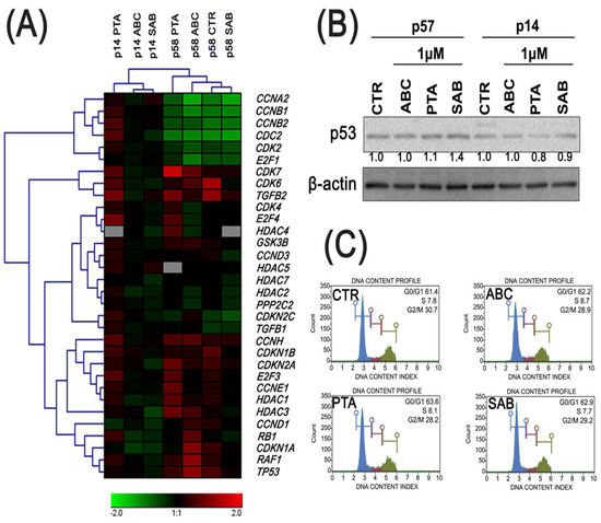 ABC, PTA, or SAB-induced changes in the cell cycle and cell cycle regulators in PCS cells at early (p14) and late passages (p57/58) after exposure for 24 h. (A) The expression profile of selected genes involved in the regulation of cell cycle. The levels of gene expression presented as the relative log10 values compared to control conditions (cells at p14 without treatments) and normalized to GAPDH gene expression. A heat map generated from qRT-PCR data is shown. (B) Western blot analysis of the levels of p53 cell cycle inhibitor. Anti-β-actin antibody was used as a loading control. The data represent the relative density normalized to β-actin. (C) DNA content-based analysis of cell cycle of late passage cells was conducted using flow cytometry. Representative histograms are presented.