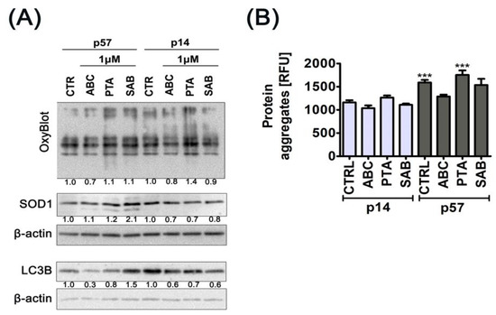 ABC-, PTA-, or SAB-induced changes in the levels of oxidative protein damage (protein carbonylation), SOD1 and LC3B level (A), and in the formation of protein aggregates (B) in PCS cells at early (p14) and late passages (p57). (A) Protein carbonylation was revealed using 2,4-dinitrophenylhydrazine (DNPH) derivatization and anti-DNP antibody. Western blot analysis of the levels of SOD1 and LC3B. Anti-β-actin antibody was used as a loading control. The data represent the relative density normalized to β-actin. (B) Protein aggregation was estimated by using PROTEOSTAT® Protein Aggregation kit according to the manufacturer’s instructions (Enzo Life Sciences, Inc., Farmingdale, NY, USA). Protein aggregates are presented as relative fluorescence units (RFU). Bars indicate SD, n = 3, *** p < 0.001 compared with control at early passage (ANOVA and Dunnett’s a posteriori test).