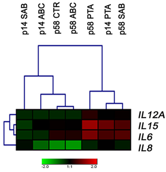 ABC-, PTA-, or SAB-induced changes in the expression of selected interleukin genes in PCS cells at early (p14) and late (p58) passages. A heat map generated from qRT-PCR data is shown. Hierarchical clustering was created using Genesis 1.7.7 software (Graz University of Technology, Graz, Austria).