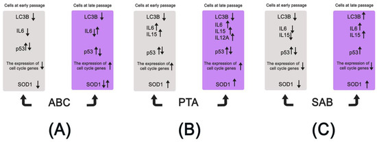 A summarizing scheme presenting the pleiotropic and age-related differential action of ABC, PTA, and SAB in human skin fibroblasts at early and late passages is shown in Figure 8.