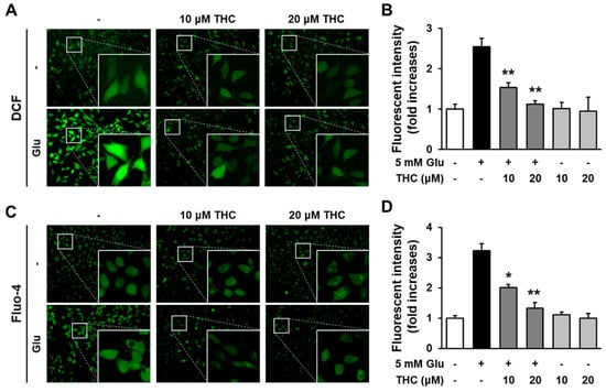 Glutamate induces oxidative stress-mediated neuronal cell death in both acute brain injuries as well as neurodegenerative disease [5]. Because oxidative stress is a major event during neuronal cell death, preventing ROS is a possible strategy for attenuating neuronal cell death. Thus, we investigated whether THC could reduce glutamate-induced accumulation of intracellular ROS in HT22 cells. The cells were exposed to 5 mM glutamate with 10 or 20 µM THC for 8 h and then stained with H2DCF-DA to evaluate intracellular ROS levels. Our results showed that THC markedly prevented the accumulation of intracellular ROS increased by glutamate treatment, and quantitative analysis showed that treatment with glutamate in HT22 cells increased the ROS production measured by fluorescent intensity of DCF to 2.54-fold, but the fluorescent intensity significantly reduced by THC (Figure 3A,B). Previously, it has been suggested that intracellular Ca2+ ([Ca2+]i) is a characteristic of neuronal cell death by glutamate-induced oxidative stress [22,23]. Therefore, we also assessed the levels of [Ca2+]i using Fluo-4 AM, a membrane-permeable fluorescent indicator for Ca2+. Our results showed that THC also prevented the glutamate-triggered elevation of [Ca2+]i from 3.22-fold increases in glutamate-treated cells to 2.0- or 1.33-fold in 10 or 20 μM THC-treated cells, respectively (Figure 3C,D). Taken together, these results suggest that THC can protect HT22 cell from glutamate toxicity through the inhibition of oxidative stress and the increase in [Ca2+]i.