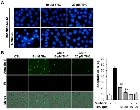 Glutamate is known to induce both necrotic and apoptotic cell death. Previously, glutamate was shown to induce apoptotic cell death during early stages and necrotic cell death at a later time [24,25]. Therefore, we mainly focused on early apoptotic cell death induced by glutamate. To investigate the effect of THC on glutamate-induced apoptosis in HT22 cells, cells were treated with 5 mM glutamate in the presence and absence of 10 or 20 μM THC for 12 h. We first stained HT22 cells with Hoechst 33342 to see a chromatin condensation, which is a morphological feature of apoptotic cell death [26]. The result showed that the chromatin condensation was observed in glutamate-treated HT22 cells, while THC completely prevented those effects of glutamate (Figure 4A). In addition, we quantitatively analyzed the proportion of apoptotic cell population. HT22 cells were stained with propidium iodide (PI) and annexin V and quantitatively analyzed using image-based cytometric analysis. Our results showed that glutamate significantly increased the percentage of annexin V-positive cells, indicating apoptotic cells, whereas PI-positive cells were not detected (Figure 3A). This suggested that most HT22 cell death caused by glutamate occurred through the apoptotic pathway. However, THC markedly reduced the percentage of annexin V-stained cells (Figure 4B). Quantitative analysis results showed that 54.12% of glutamate-treated cells were annexin V-positive, while only 21.22% and 12.35% annexin V-positive cells were observed among glutamate-treated cells treated with 10 and 20 μM THC, respectively (Figure 3B). This shows that THC significantly reduced the number of apoptotic cell deaths after treatment with glutamate in HT22 cells.