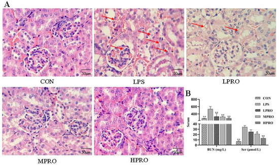 As shown in Figure 2, no significant pathological changes were found in the kidneys of control mice. In contrast, obvious renal pathological damage was observed in mice with LPS-induced AKI, including glomerular atrophy, large number of red blood cells, tubular cell vacuolation, tubular dilation and distortion, tubular cell necrosis, and nuclear loss. However, these LPS-induced pathological changes were significantly attenuated by PRO dose-dependently. In addition, the levels of BUN and Scr in mice treated with LPS increased significantly, which were reduced by PRO.