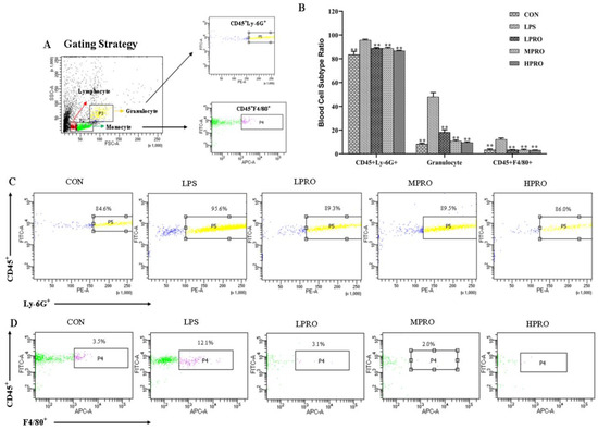 Effects of protopine on the blood cell subtype in mice with LPS-induced AKI (n = 8 mice per group). (A) Gating Strategy. (B) Effects of protopine on the blood cell subtype ratio in mice with LPS-induced AKI. (C,D) Effects of protopine on the ratio of CD45+Ly-6G+ and CD45+F4/80+ in mice with LPS-induced AKI. * p < 0.05, ** p < 0.01 compared with the LPS group. (LPRO: low-dose protopine; MPRO: medium-dose protopine; HPRO: high-dose protopine; LPS: lipopolysaccharide; AKI: acute kidney injury).
